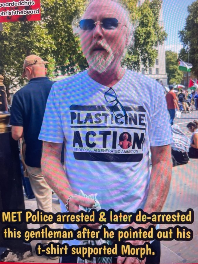 Remember that dude with the Plasticine Action tshirt, with the pic of Morph on it, who got arrested for wearing it in London? He has set up a site selling the tshirts with all proceeds going to the charity Medical Aid for Palestinians (MAP). You know what to do! ⬇️ plasticineaction.com