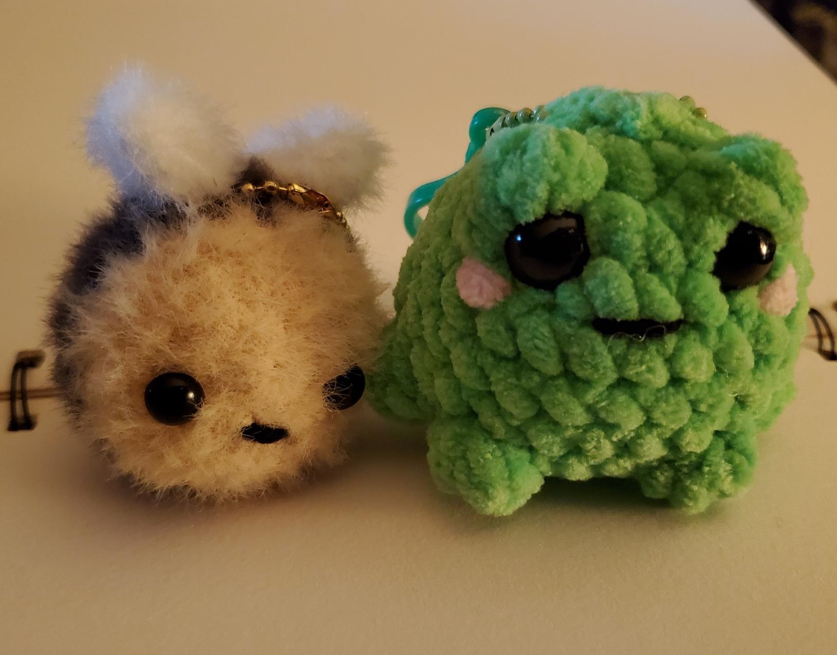 I was able to afford these 2 super cute clip-on buddies. A crochet frog & a plush fuzzy bumblebee 🐸🐝💗