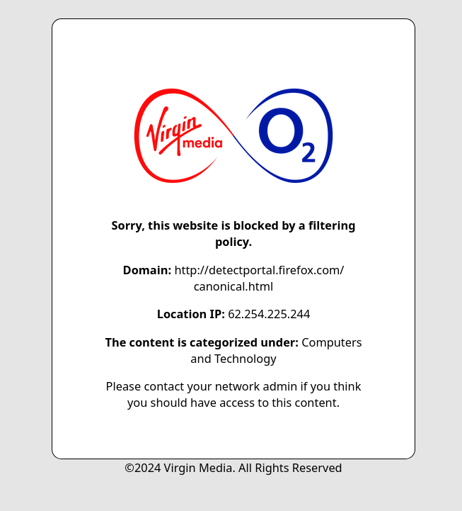 Love to see that Virgin UK/O2 have blacklisted "http://detectportal.firefox.com/canonical.html" (the URL Ffox uses to invoke a captive portal, such as the ones you have to clear in order to use public hotspots with Virgin as a provider). Also nice to see that they've copyrighted the error page.